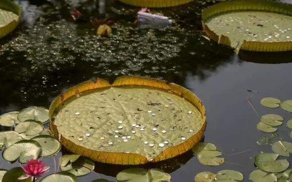 山东济南大明湖景区水池里盛开的王莲,也被不少游客当成“许愿花”。有的硬币落在叶面上,有的则砸穿叶片落入水池中,硕大的叶子成了“蚂蜂窝”。