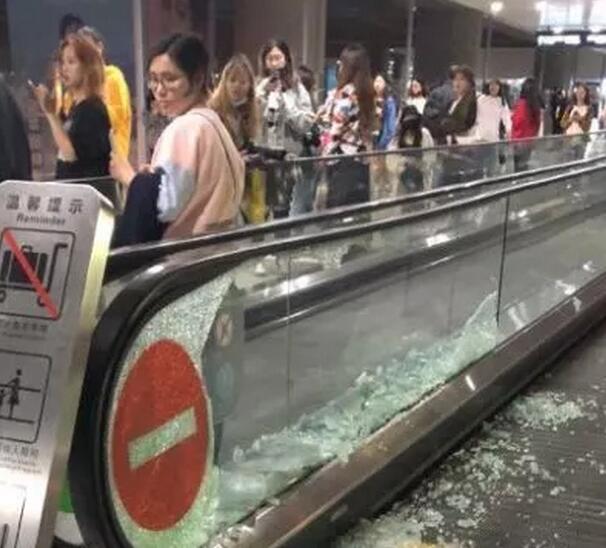 上海虹桥机场大量明星粉丝前来接机,结果把玻璃挤爆了,现场的目击者称,整个航站楼里都是年轻男女,有的拿着粉丝牌,有的拿手机拼命拍,一看就知道是粉丝,一楼和二楼站满了人!狂热的粉丝甚至将航站楼内的自动步道玻璃都挤爆了。