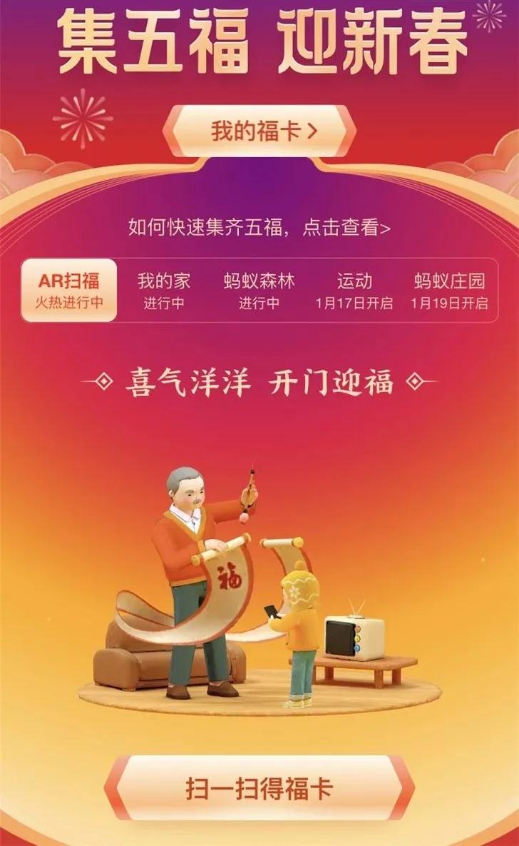 除了传统的AR扫福字、蚂蚁森林浇水、沾福气,还可以去领福袋,扫描星巴克标志、安慕希定制福、中国移动定制福、可口可乐定制福。