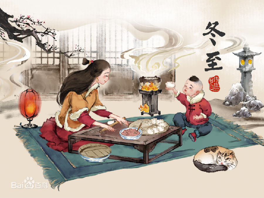 冬至,又称日短至、冬节、亚岁等,兼具自然与人文两大内涵,既是二十四节气中一个重要的节气,也是中国民间的传统节日。冬至是四时八节之一,被视为冬季的大节日,在古代民间有“冬至大如年”的讲法。冬至习俗因地域不同而又存在着习俗内容或细节上的差异。在中国南方地区,有冬至祭祖、宴饮的习俗。在中国北方地区,每年冬至日有吃饺子的习俗。