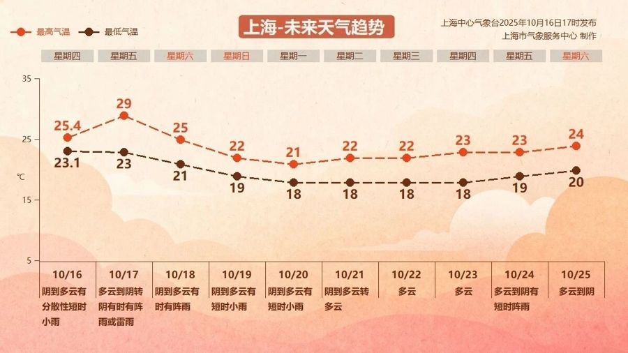 本周五白天上海的最高气温仍有29℃。周六早晨较强冷空气开始影响申城,气温逐步下降,周日最高气温下降至21~22℃,降幅可达6~8℃,周日和下周一早晨最低气温降至18~19℃。预计周日至下周四,上海日平均气温将连续五天低于22℃,有望进入气象意义上的秋天。