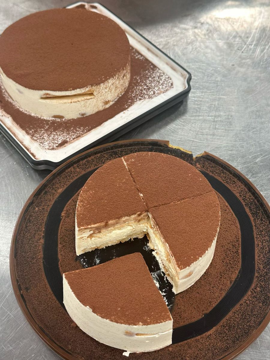 眼前的提拉米苏,是一场视觉与味觉的双重盛宴。整颗蛋糕圆润饱满,表层均匀地撒着深棕色的可可粉,如同一层细腻的绒毯。切开的部分,层次分明的结构清晰可见,轻盈的马斯卡彭奶酪层与浸满咖啡酒的手指饼干层交叠,像是甜点师精心搭建的甜蜜城堡。