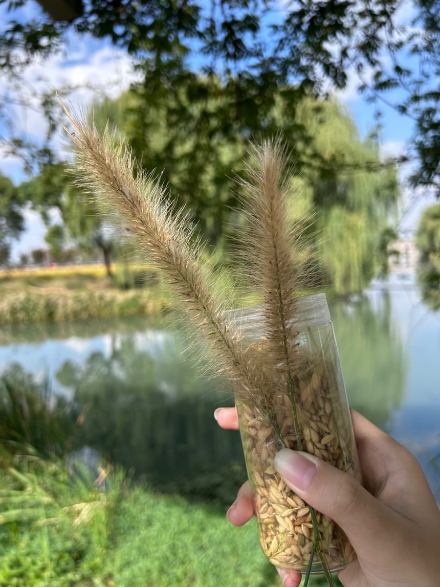 手中的透明小瓶里,装着金黄的稻粒,旁侧几枝狗尾草毛茸茸的,在阳光下泛着柔和的光。这里的天地开阔而清新,湖水如镜,映着蓝天、绿树,还有远处隐约的景致。漫步其间,仿佛所有的喧嚣都被隔绝在外,只有自然的气息在鼻尖萦绕。狗尾草的轻软,稻粒的质朴,与公园的野趣融为一体,每一处角落都藏着治愈的小确幸,让人心在这一方天地里,慢慢沉静,享受这独属于郊野的悠闲与诗意。