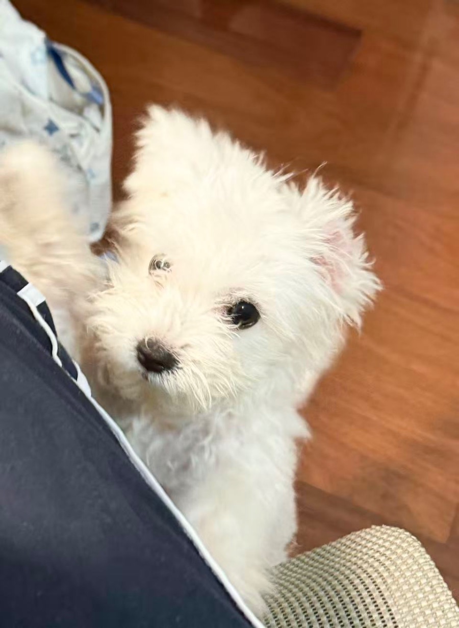 今天家里迎来了新成员——一只可爱的小白狗。它有着蓬松的白色毛发,像个移动的棉花糖。我一坐下,它就热情地凑过来,用那双黑亮的眼睛望着我,还伸出小爪子轻轻搭在我腿上,仿佛在说:"你好,我是你的新朋友。"