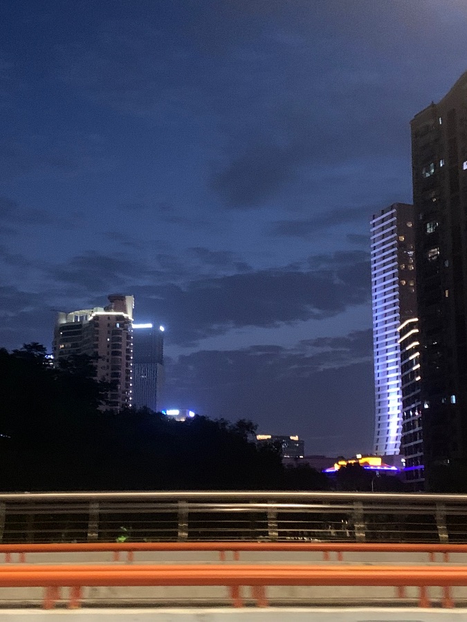 那是一个放学的傍晚,我走在回家的路上,偶然抬头,被眼前的夜景深深吸引。天空呈现出深邃的蓝色,几朵云彩悠闲地漂浮着。远处的高楼大厦在夜色中亮起了灯光,有的明亮耀眼,有的则温柔柔和。左侧的一栋建筑顶部闪烁着白色的光芒,像是在向我招手。右侧的高楼则被蓝色的灯光勾勒出优美的轮廓,显得格外现代。街道两旁的树木在夜色中显得有些模糊,但它们的轮廓依然清晰可见。我停下脚步,静静地欣赏着这美丽的夜景,心中充满了宁静与惬意。