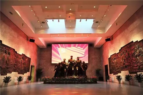 序厅展示的是工农联盟大型雕塑,革命士兵、知识分子、工人、农民和妇女的雕塑形象栩栩如生。序厅两侧的墙上嵌有连贯浮雕,刻画当年的《新青年》杂志创办、五 四运动轰轰烈烈开展等史实,呼应了中共四大的重要历史地位——中共四大的召开为迎接即将到来的大革命高潮做了政治、思想和组织上的准备;同时,四大也见证了当年由全国994名党员组成的中共队伍在随后的工农群众运动中迅猛壮大,终于形成了领导中国革的强大力量。