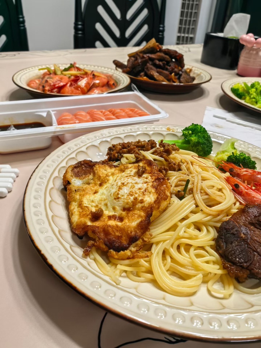 最惹眼的是面前这盘意面,根根顺滑的面条裹着细碎的肉酱,旁边卧着一枚煎得金黄焦脆的荷包蛋,边缘微微翘起,蛋白蓬松,蛋黄带着恰到好处的溏心,光是看着就让人食欲大开。一旁的酱牛肉纹理紧实,浸着浓郁的卤香,还有两只红亮的鲜虾卧在盘边,衬得整盘面都鲜活起来。
