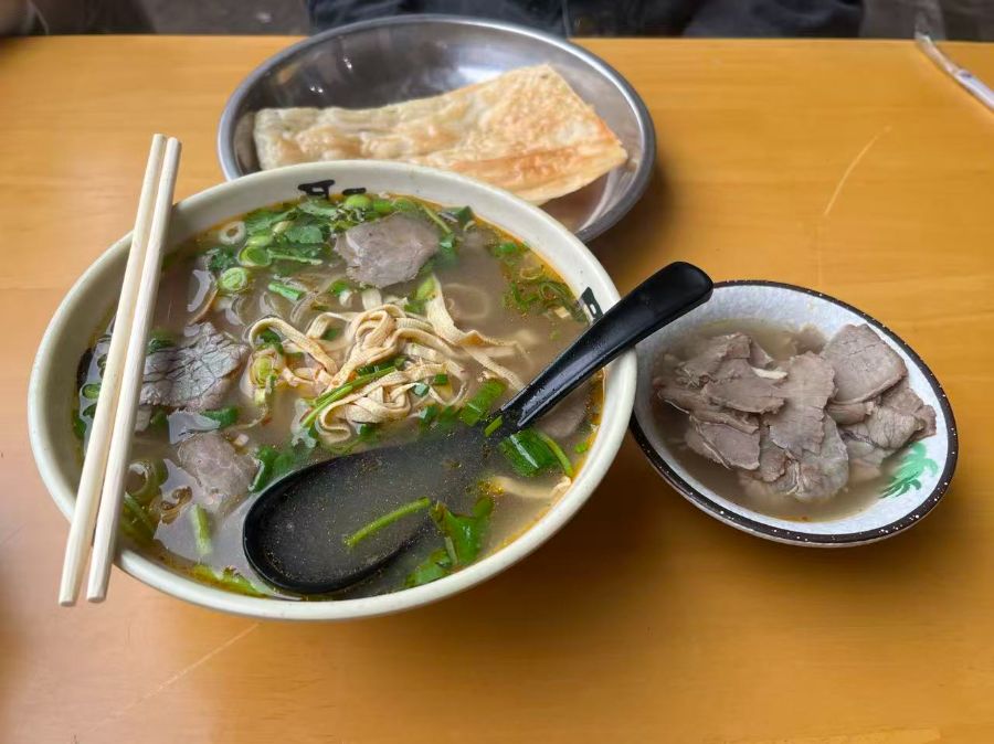 这张图片展示了一桌热气腾腾的中式早餐,以牛肉汤为主,整体色调温暖,充满烟火气。画面中央是一大碗牛肉汤,汤色清亮,漂浮着鲜嫩的牛肉片、金黄的豆腐丝,以及翠绿的葱花和香菜,汤碗里斜插着一把黑色的长柄汤勺,左侧放着一双白色的筷子。汤碗右侧是一个小瓷碟,里面盛着几片切好的熟牛肉,浸在少量汤汁中,肉质纹理清晰。汤碗后方的金属小盆里,放着一块金黄酥脆的油饼,外皮焦香,看起来十分诱人。所有餐具都摆放在一张干净的黄色木质桌面上,背景简洁,突出了食物本身。整份餐食搭配均衡,牛肉汤鲜美醇厚,油饼酥脆,牛肉片扎实,色彩搭配丰富,让人食欲大开,尽显地道的市井风味与满足感。