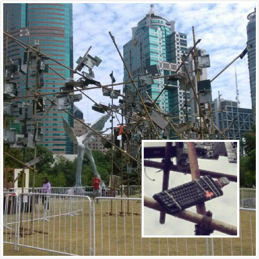 其中最为惊叹的是一个需要大量的小型电子废弃物作为创作材料的“电子树”。“电子树”上也有我们12届毕业同学捐献的小键盘。
