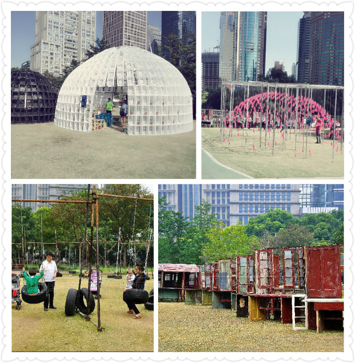 本次环保展利用废弃物品为创作材料,创作全新的装置艺术展览中建筑师用日常生活中的可乐瓶、轮胎、塑料框、旧门窗、光盘以及各种小件电子垃圾废旧物品经过巧妙设计变身为实用的艺术装置,而展览结束之后,大部分作品会被送回再生资源回收平台进行拆解。
