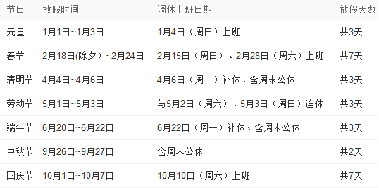 春节已经结束了,不少小伙伴表示对于假期还是恋恋不舍。不要着急,既然三月已经到了,那么清明小长假还会远吗!而且呢,小编要告诉大家一个好消息,根据日历以及政府公告,今年清明、端午、中秋还有劳动节都适逢周末,因此大家不必再为了调休补课而晕头转向了~但是不知为何,原本中秋节的三天假期却缩水到了两天。(放假安排详情见下图)