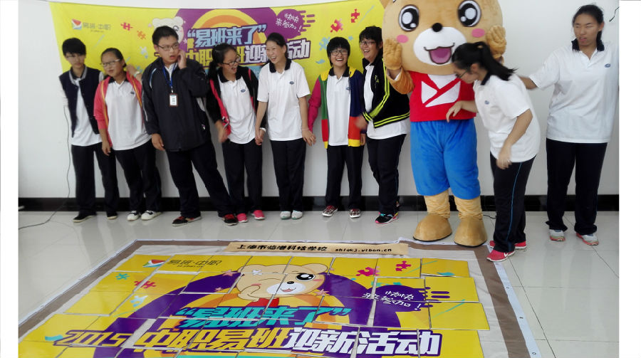9月16日中午12点,2015易班迎新活动在上海市临港科技学校教学楼西侧拉开了序幕,可爱的“易班熊”伟伟的出没,立刻点燃了活动的气氛,许多学生,纷纷前往活动地,和易班吉祥物拍照留念,然后和易班工作人员一起互动,争先恐后地回答易班的有关知识,笑逐颜开地展示他们获得的易班纪念品。